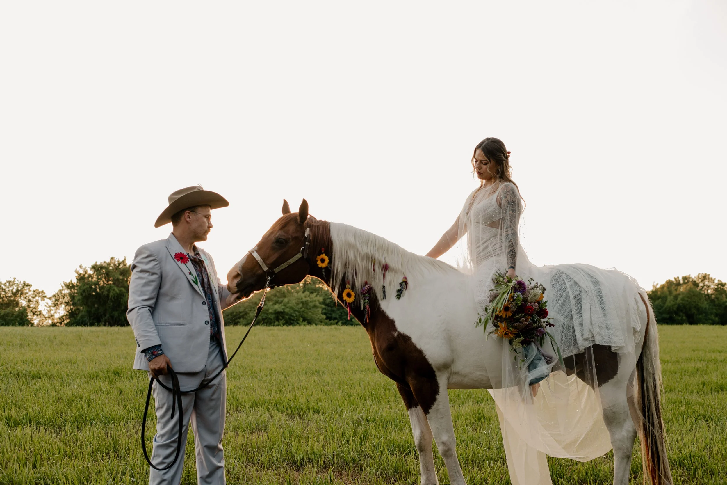 Let’s talk about the horse for a second. You don’t often see horses at weddings (unless you’re at the kind of fancy affair where there’s also a string quartet and a five-course dinner). But wow—this majestic creature brought a cinematic, fairy-tale element to the shoot. Watching the models (shoutout to @rippinruts and @aubrinatheteenagewitch) gracefully pose in wedding attire while riding was nothing short of magical. Trust me, it’ll have you reconsidering your wedding plans just to include a horse.