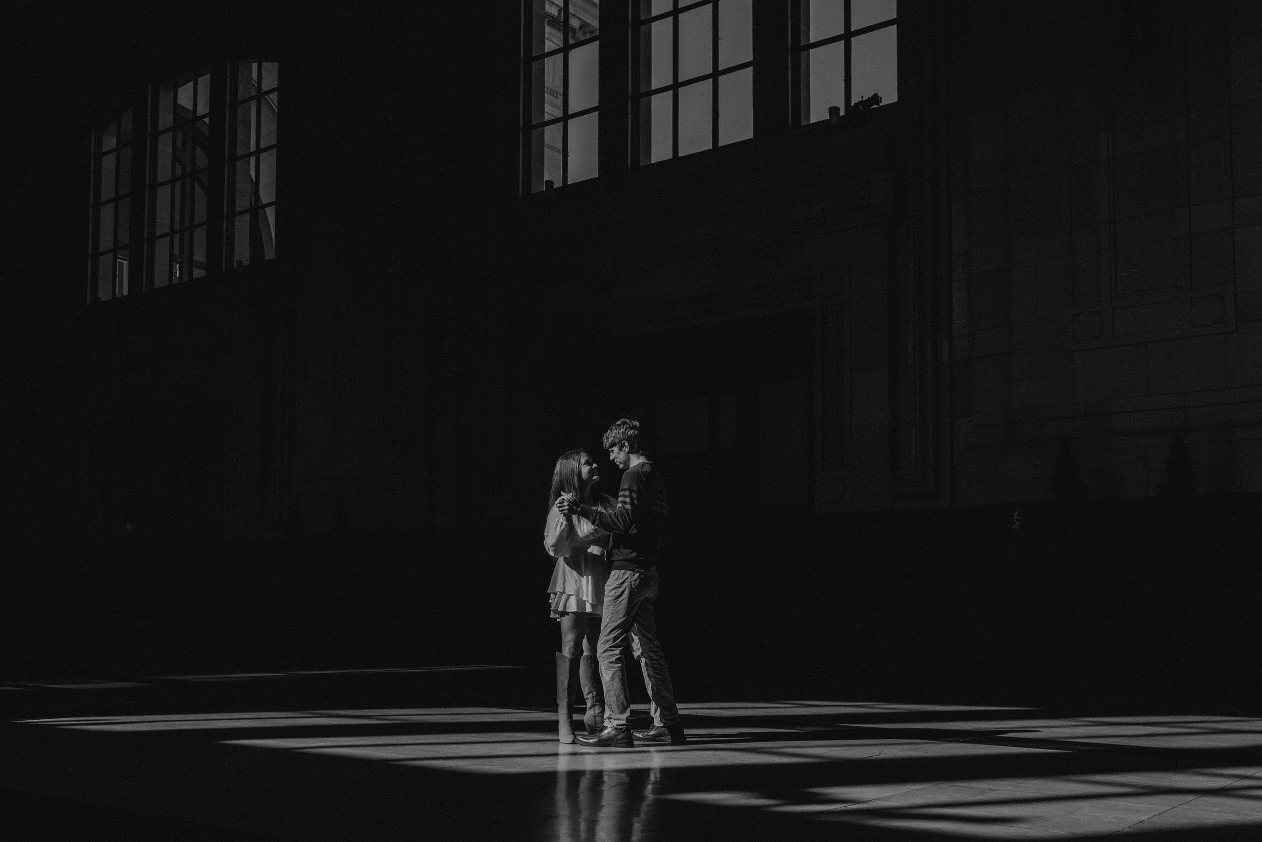 Fast forward to their engagement session, and the vibe was simple: they were up for anything, and I got to let my creativity run wild. Tara and Kyle are one of those couples who just click. They’re chill, they’re fun, and they didn’t even flinch when I started geeking out about the light bouncing off the station’s marble floors or the dramatic shadows in the arched windows.